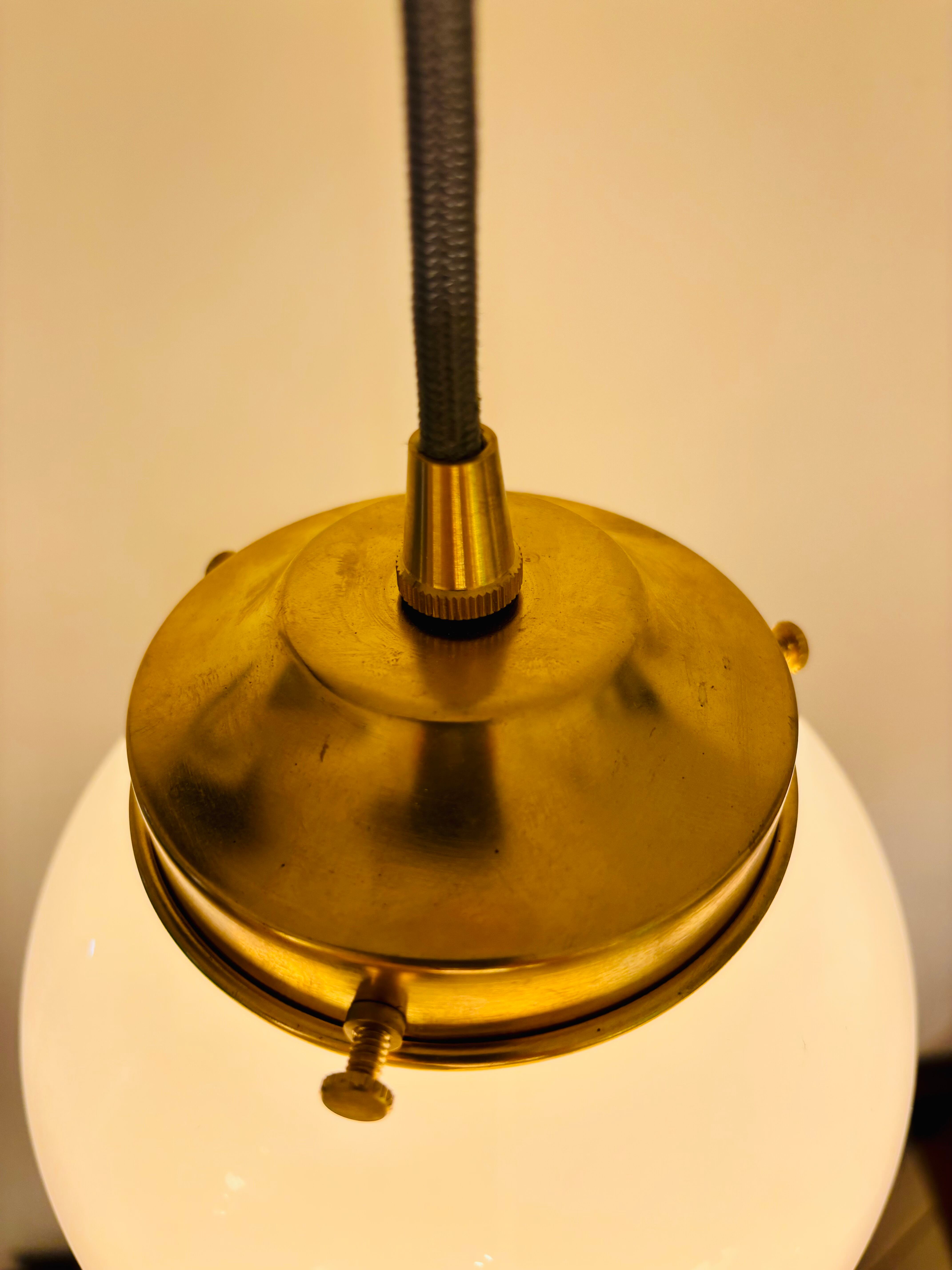 デイビスリンチのball6を引掛シーリング用のペンダントライトにしました。天井側のカバーは真鍮の角形です。真鍮は無塗装ですので経年変化していきます。コードはグレーの丸コードです。厚みのあるガラスが柔らかく拡散されます。白いガラスですので調光できる電球