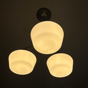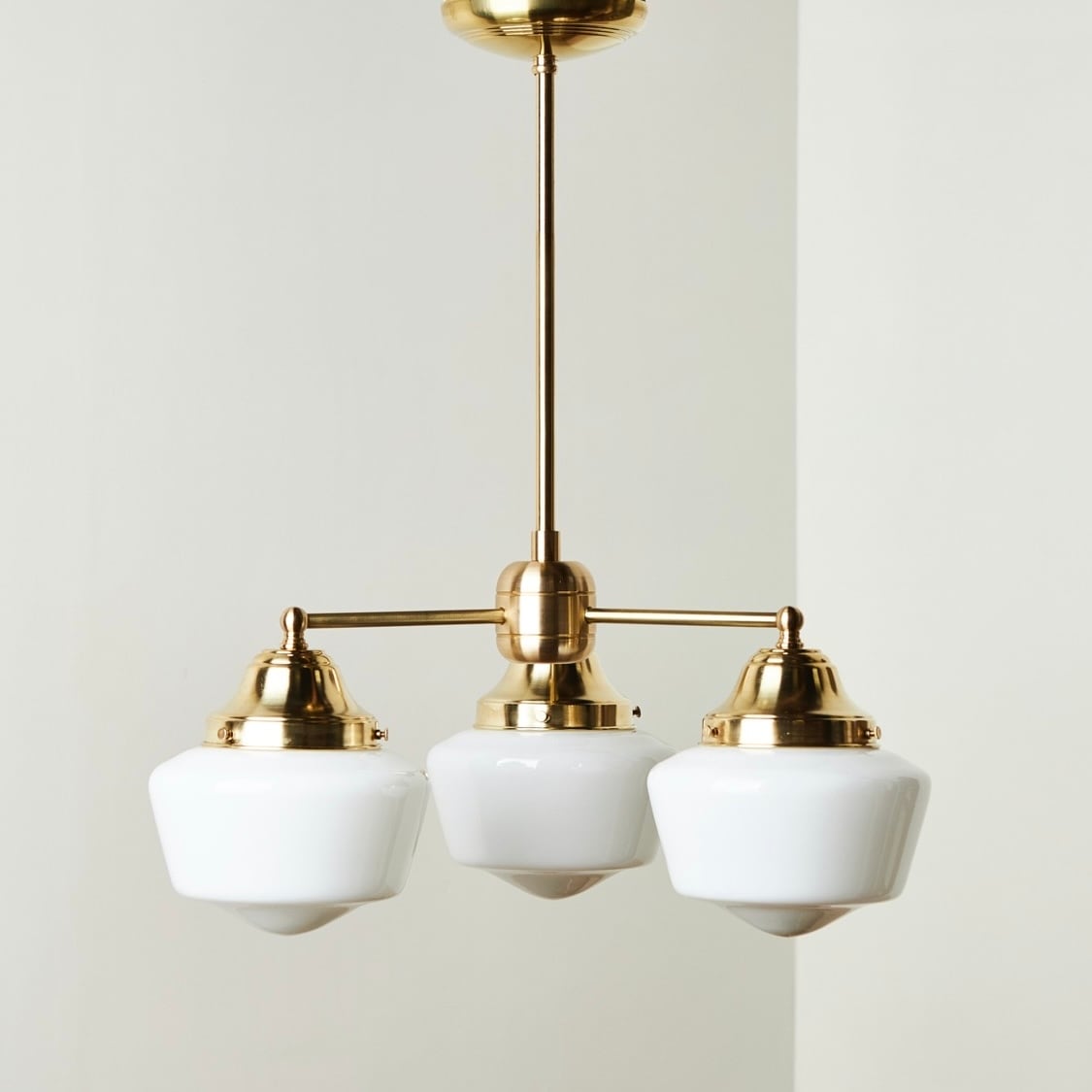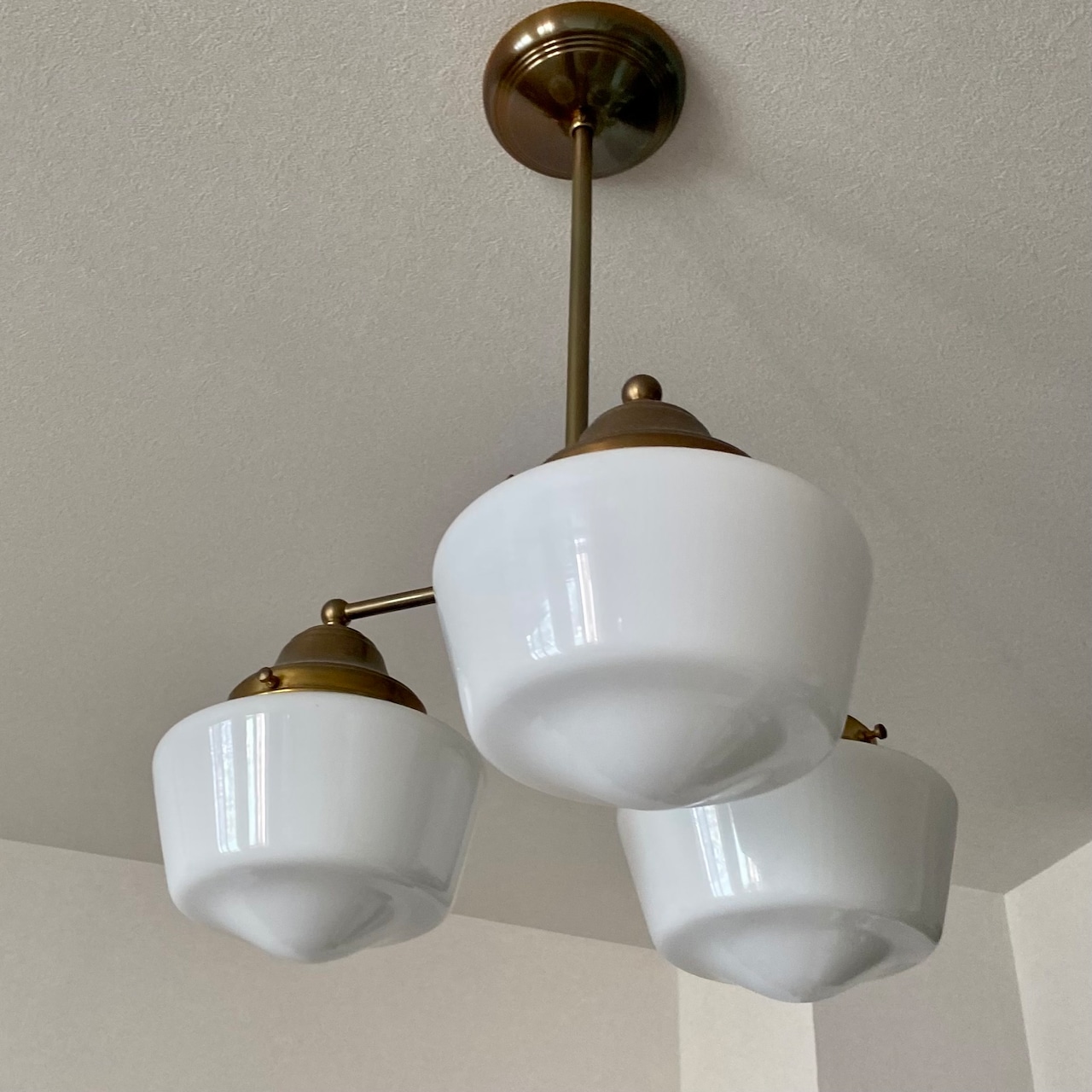 DAVIS-LYNCH GLASS COMPANYのミルクガラスschool house7inchを3灯の真鍮の器具に合わせたオリジナル照明です。