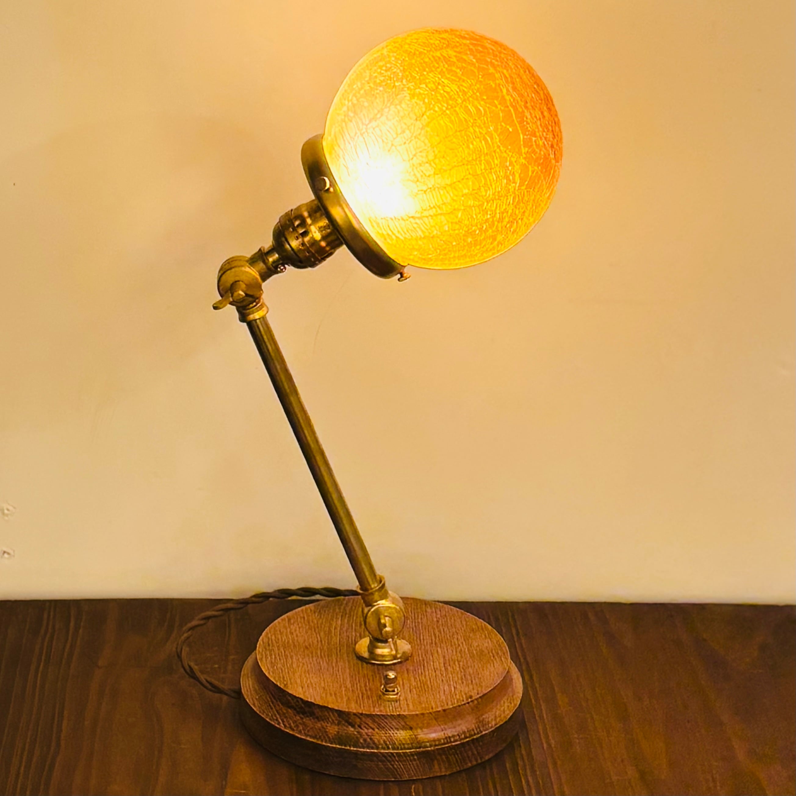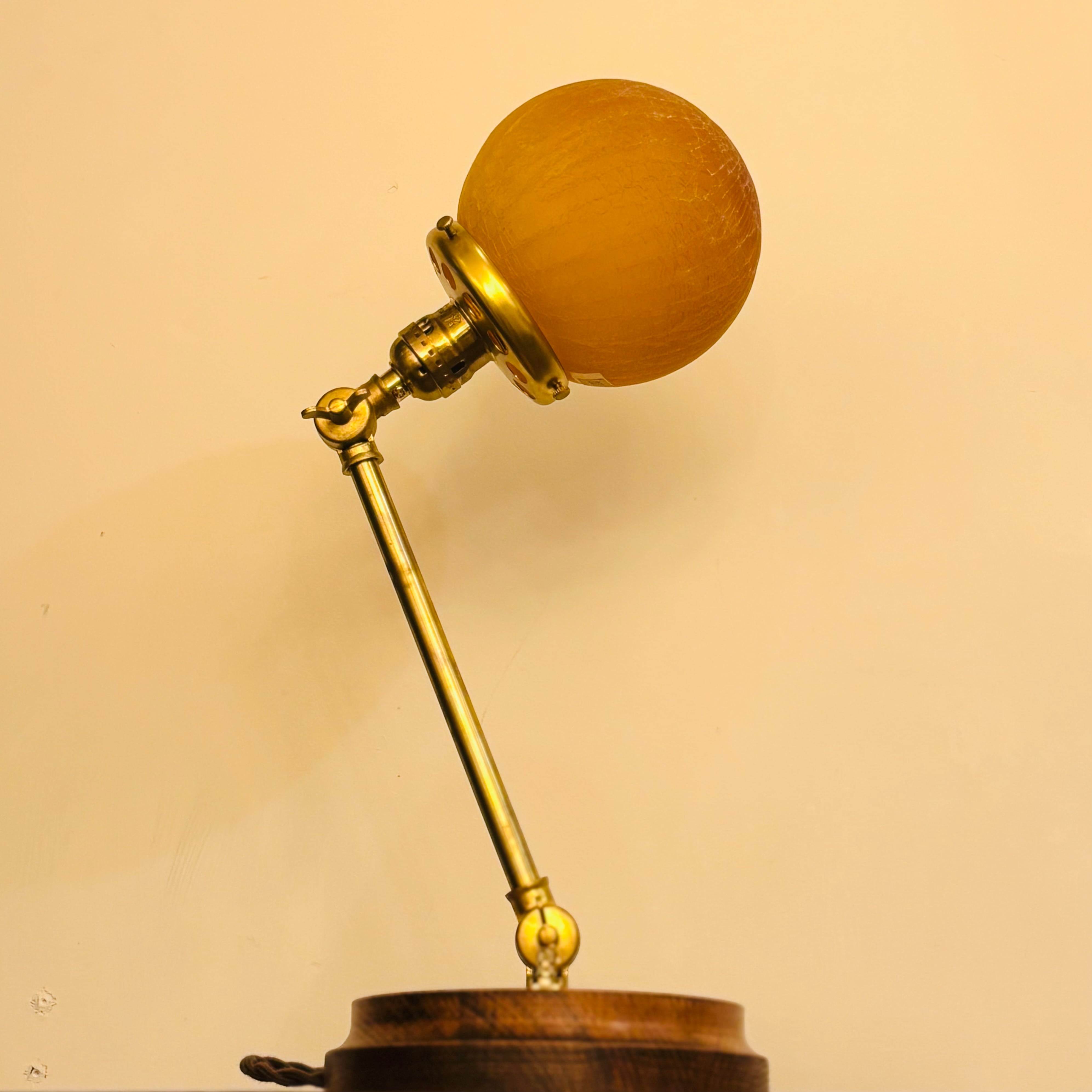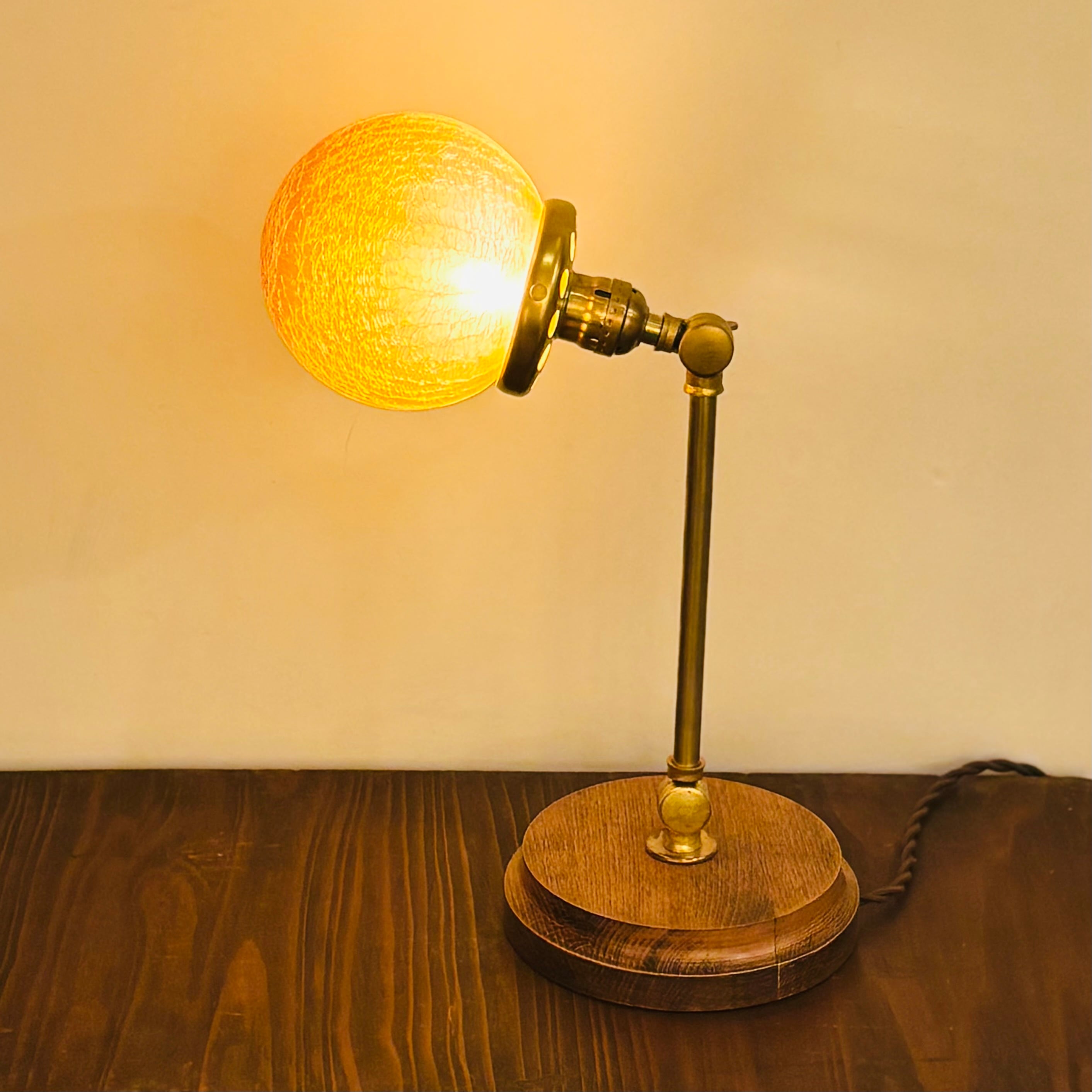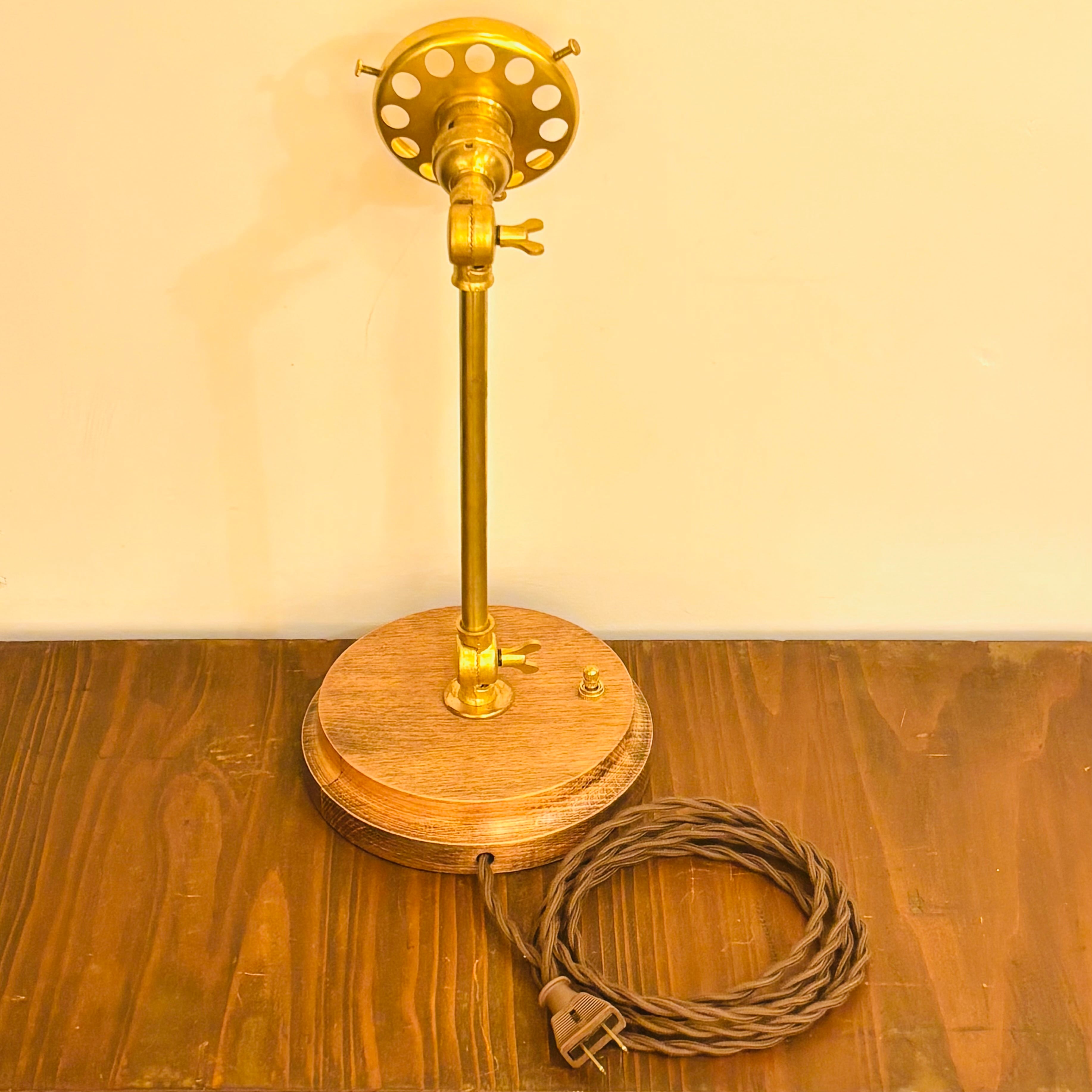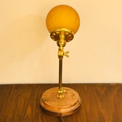 無塗装の真鍮と木製の台座を組み合わせた角度が変わるテーブルランプです。壁付することも可能な様に裏に器具を2箇所付けてあります。