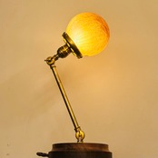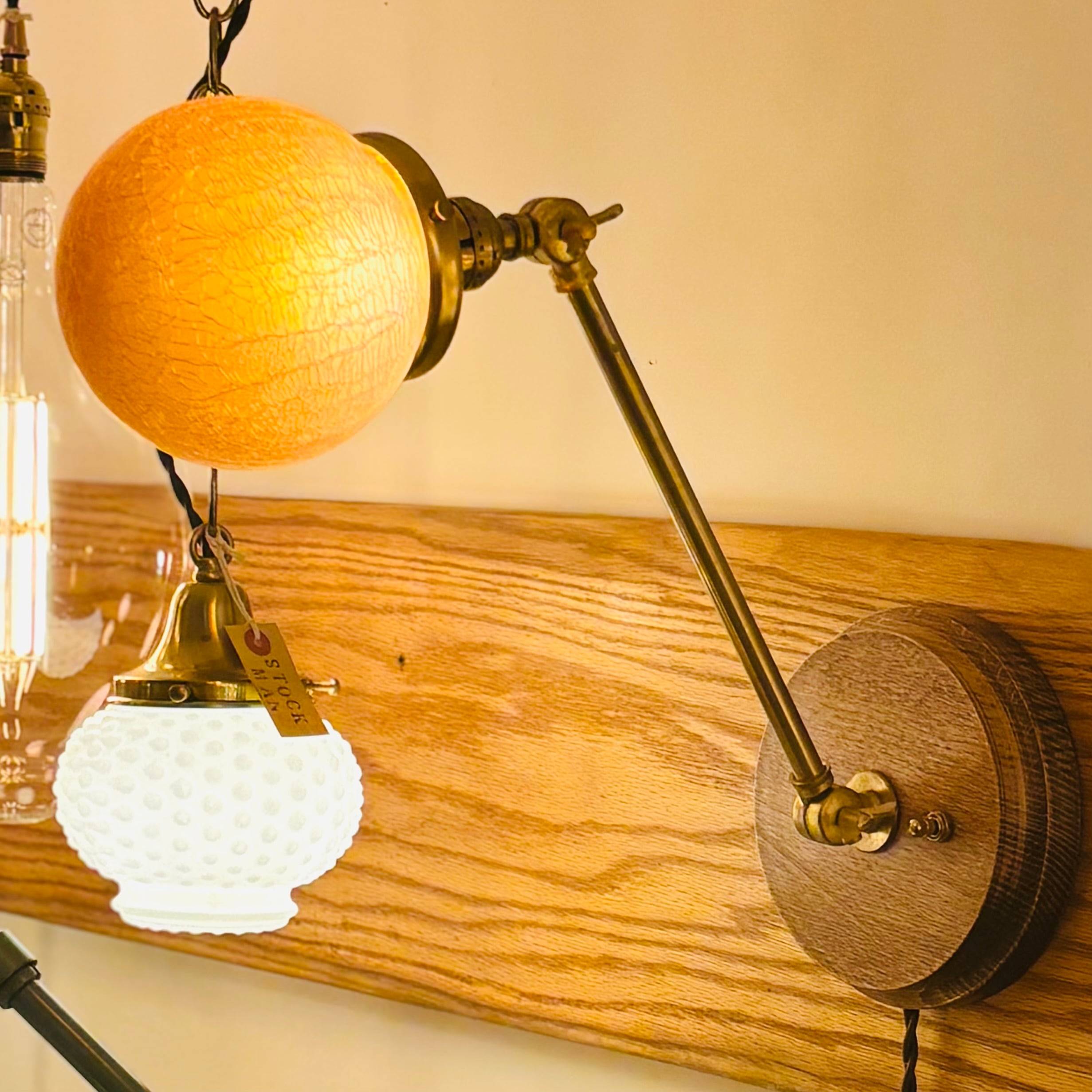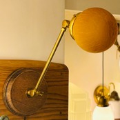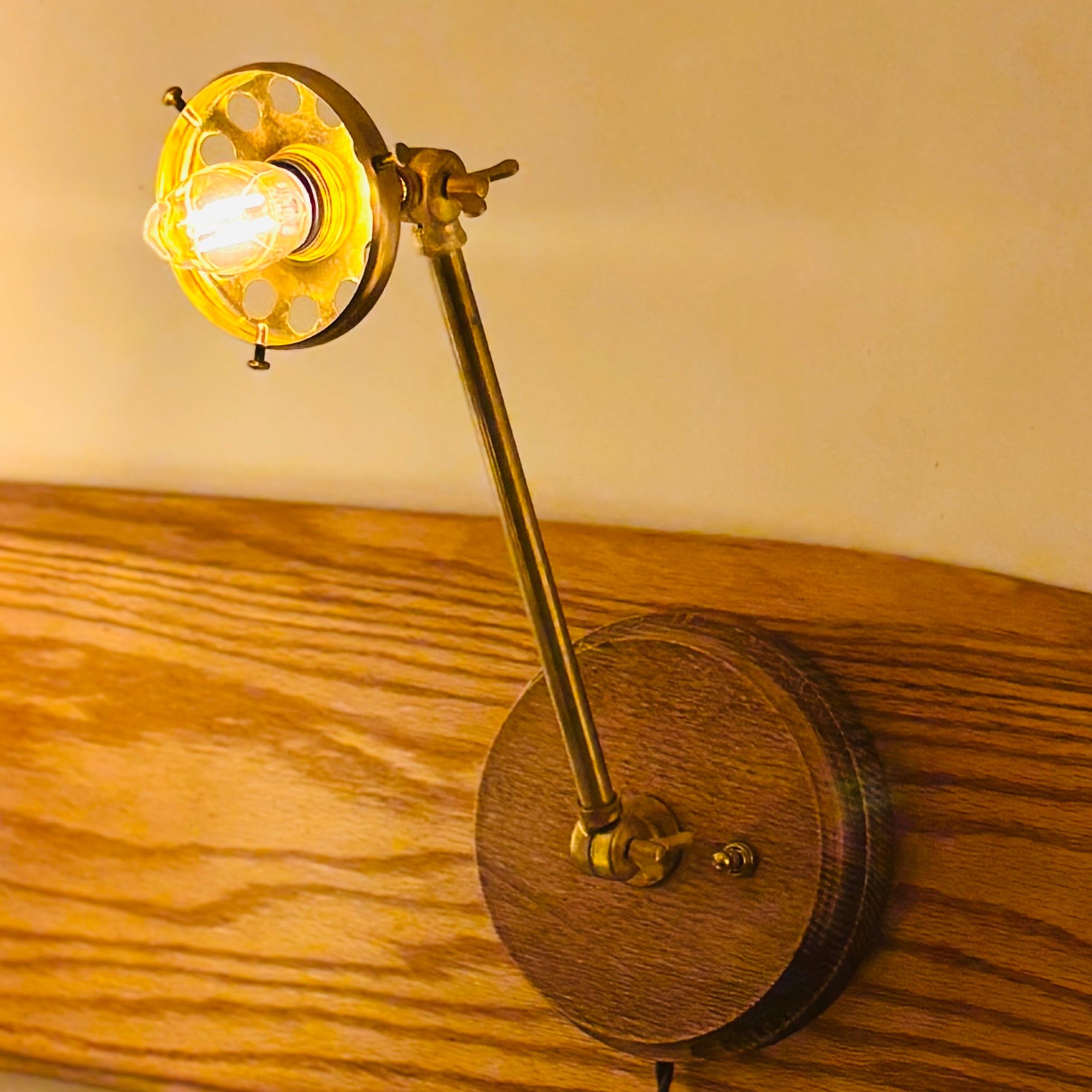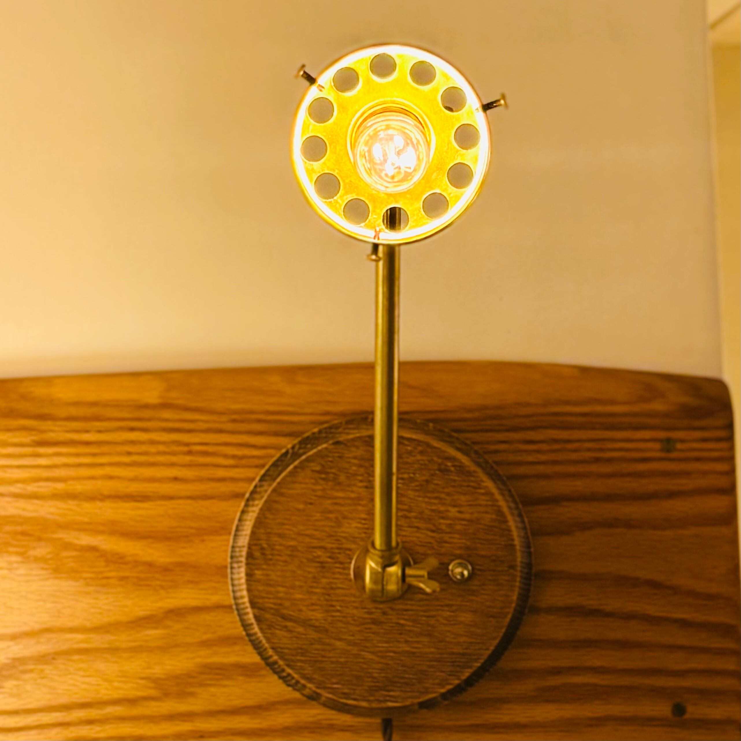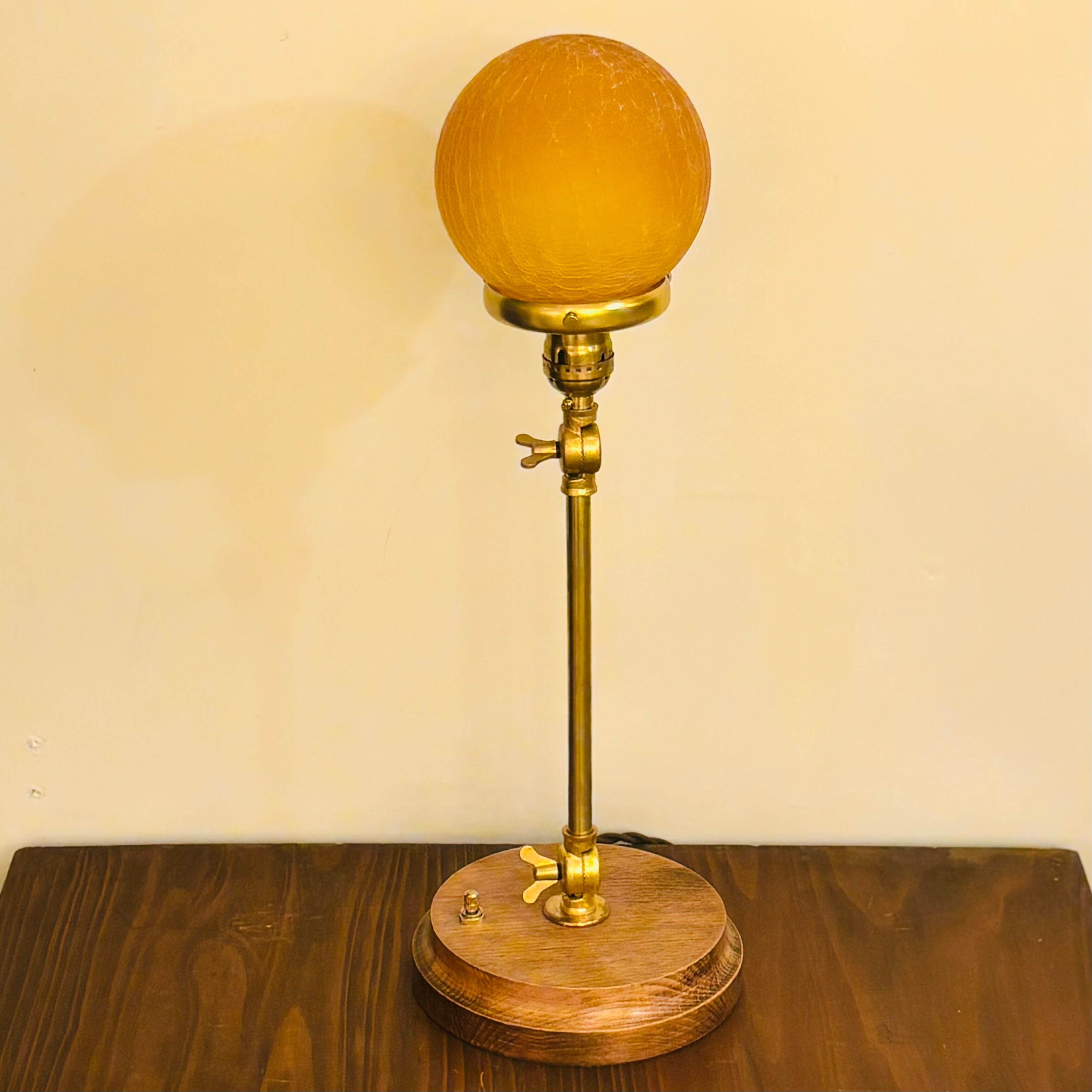 無塗装の真鍮と木製の台座を組み合わせた角度が変わるテーブルランプです。壁付することも可能な様に裏に器具を2箇所付けてあります。