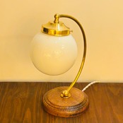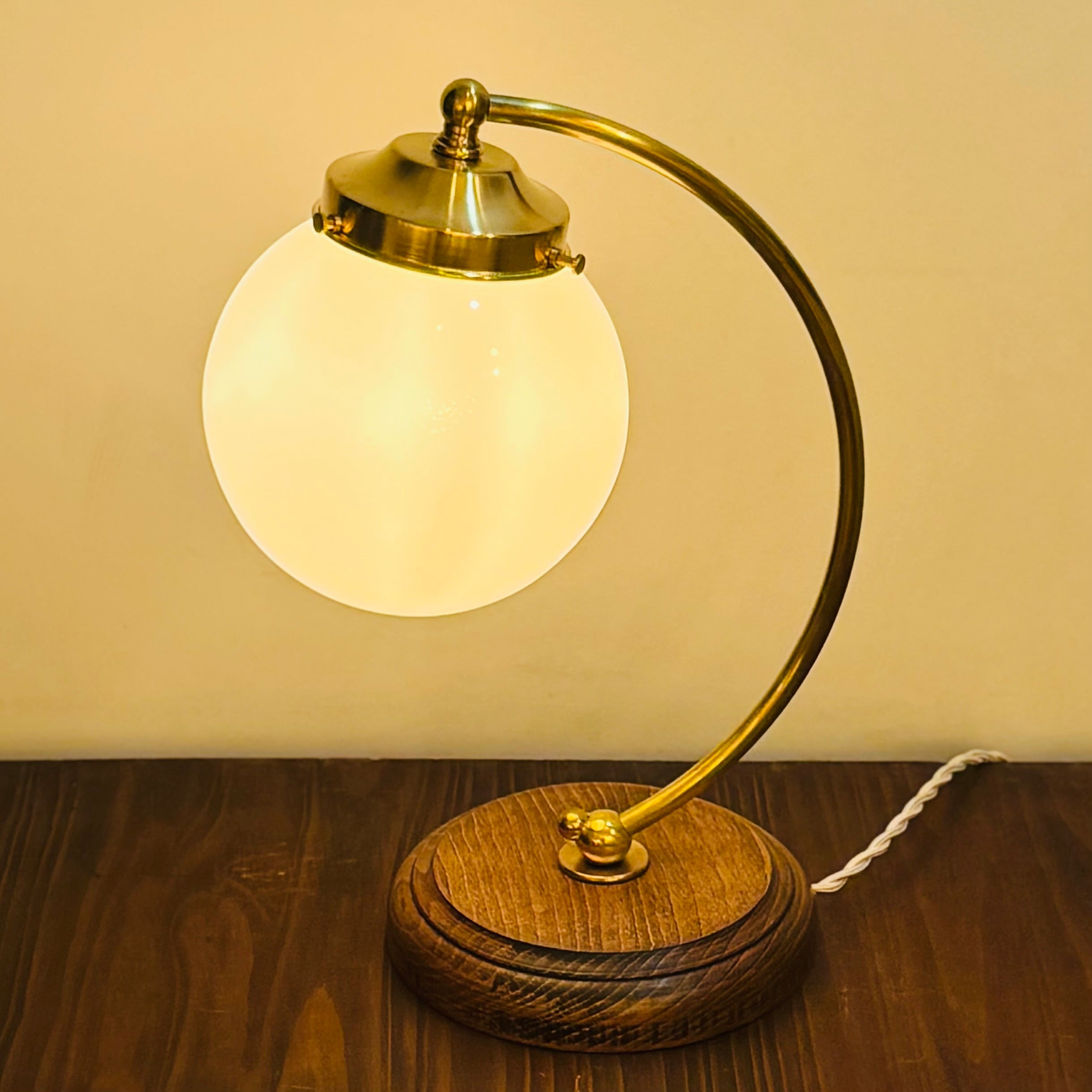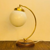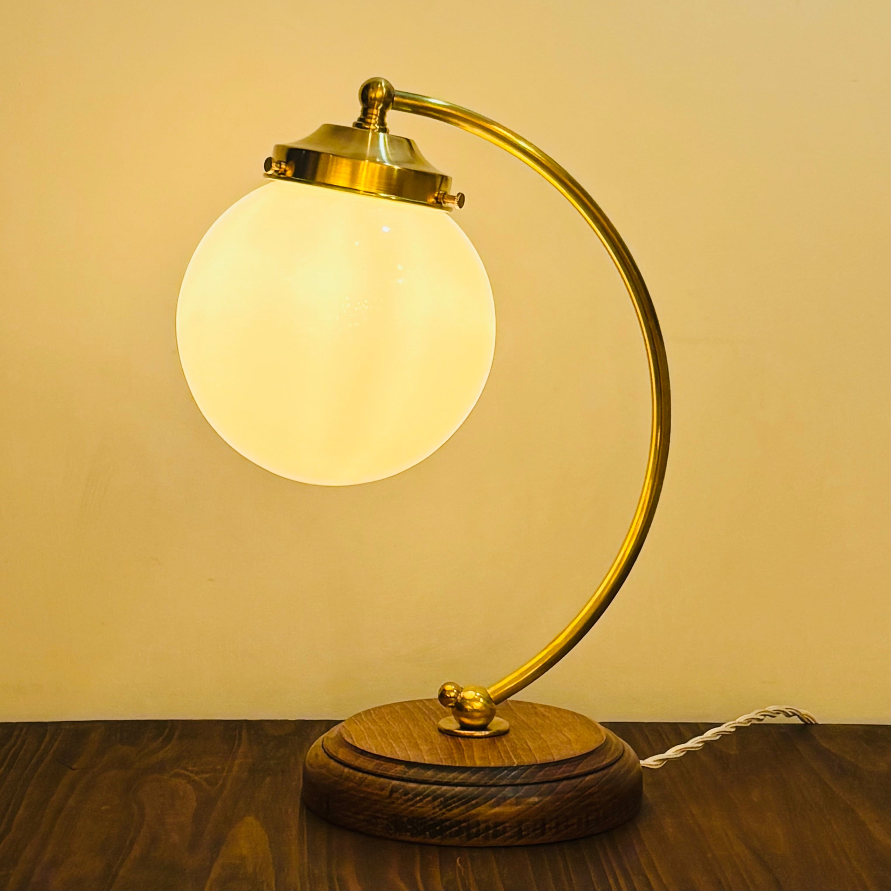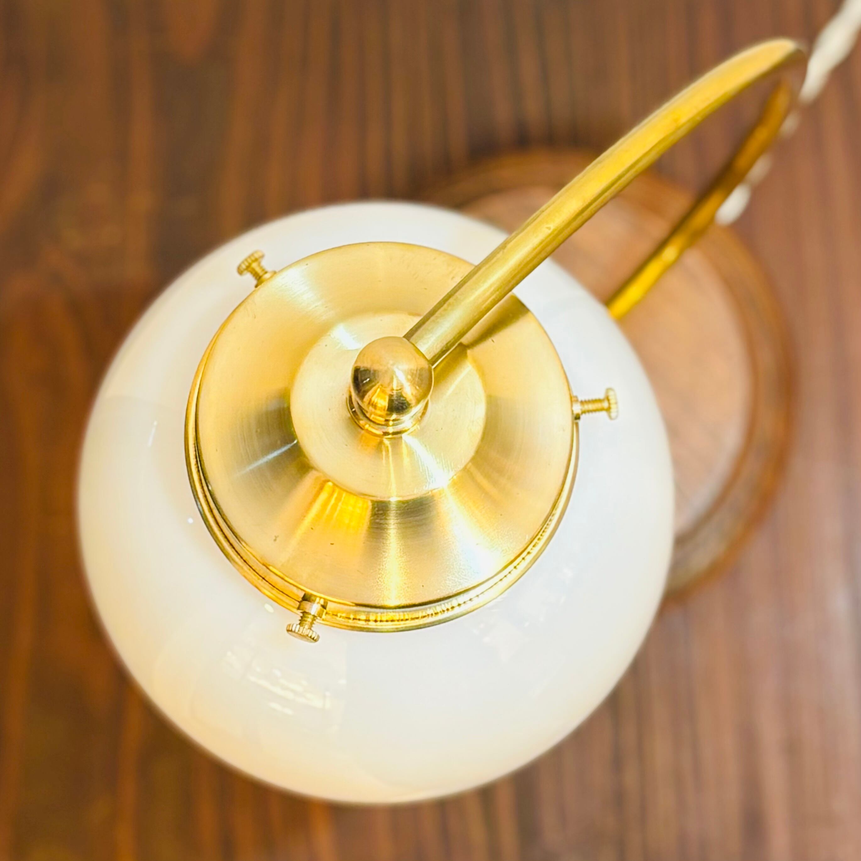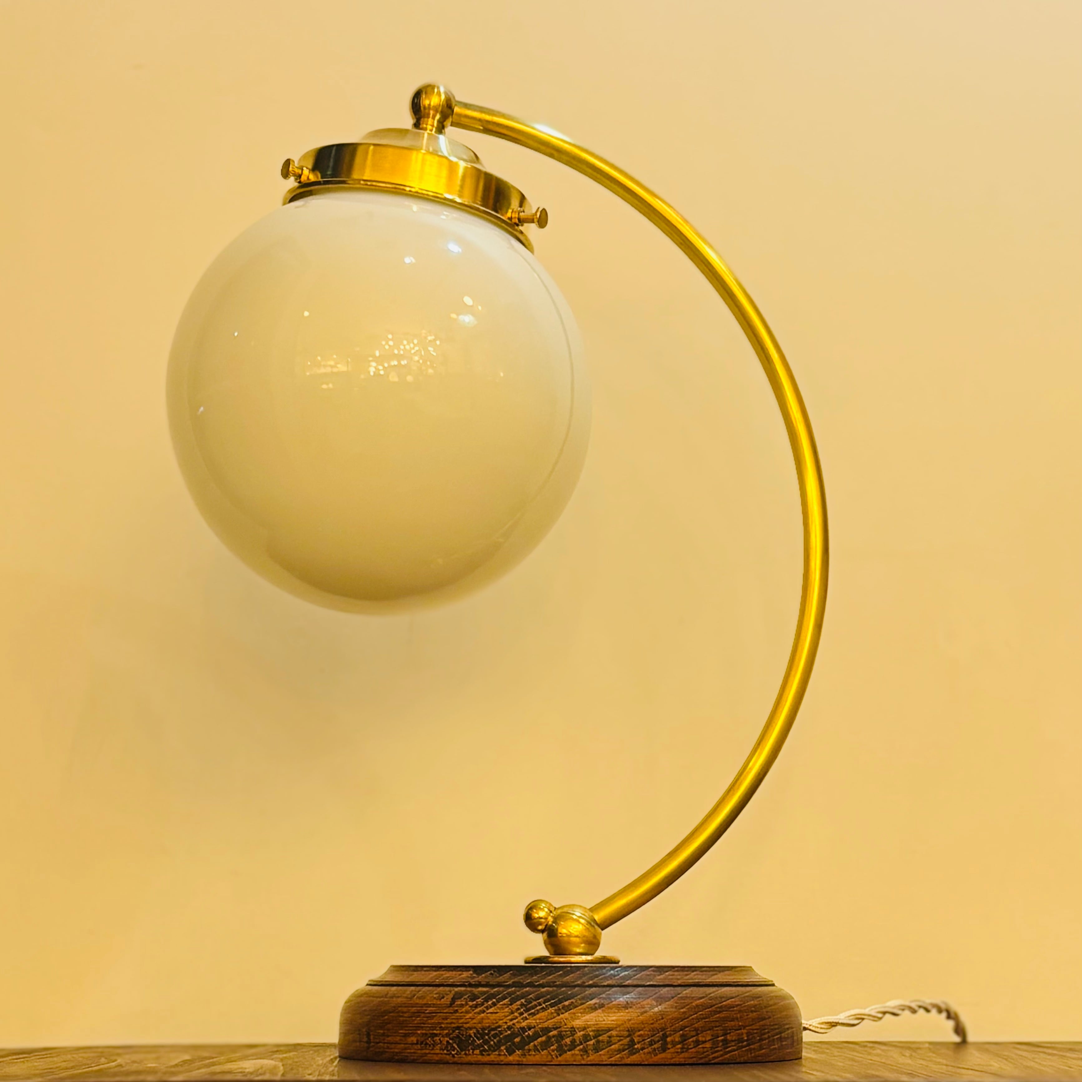 アメリカのデイヴィスリンチ社のシェードBall6とオリジナルの弓形の器具を組み合わせたテーブルランプです。写真はオリジナルのキャンドル球で撮影しました。Bluetoothで調光、調色ができるphilips hueを合わせて使用するのもおすすめです。
