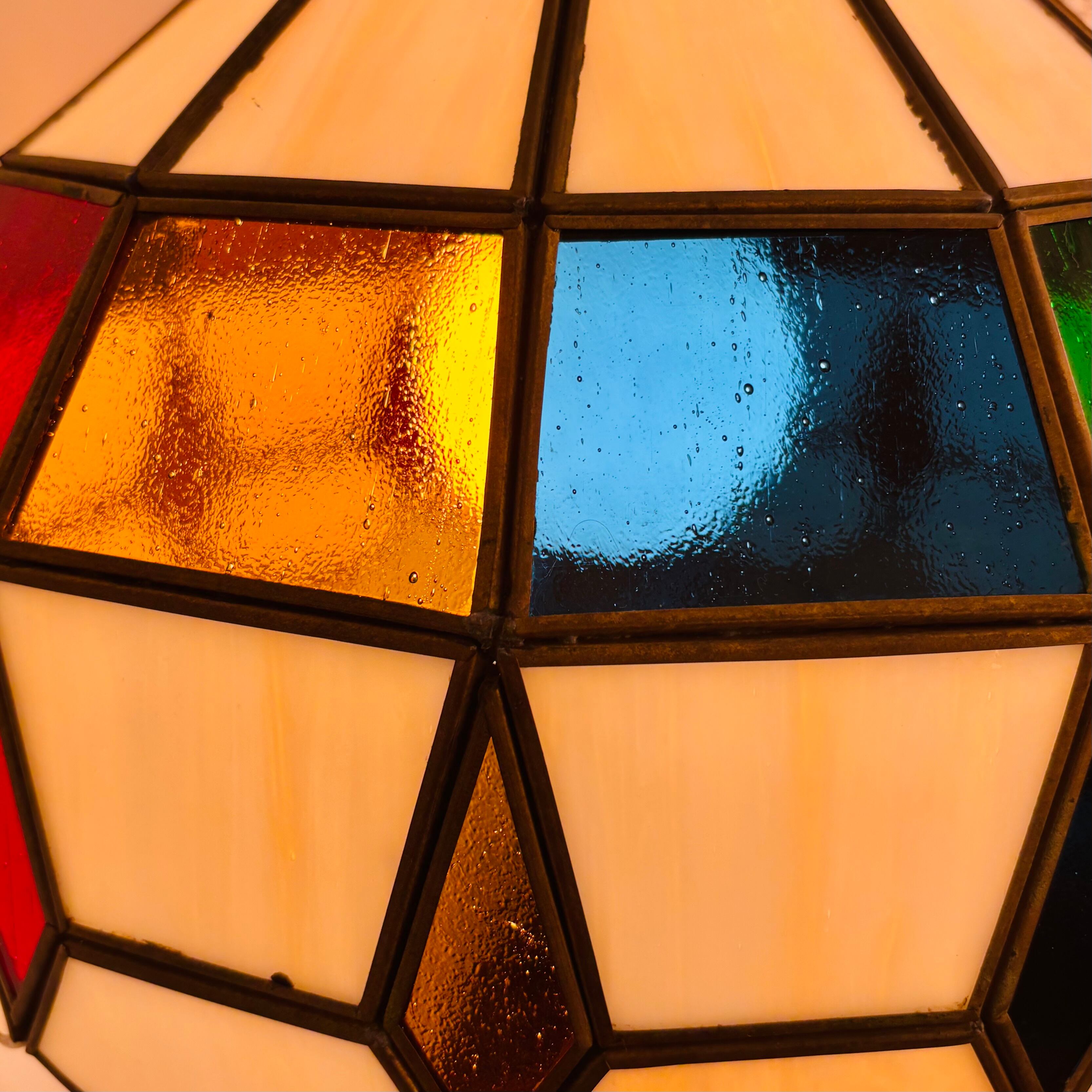 アメリカから仕入れた70年代のカラフルなステンドグラスのシェードを真鍮無塗装の器具と合わせました。