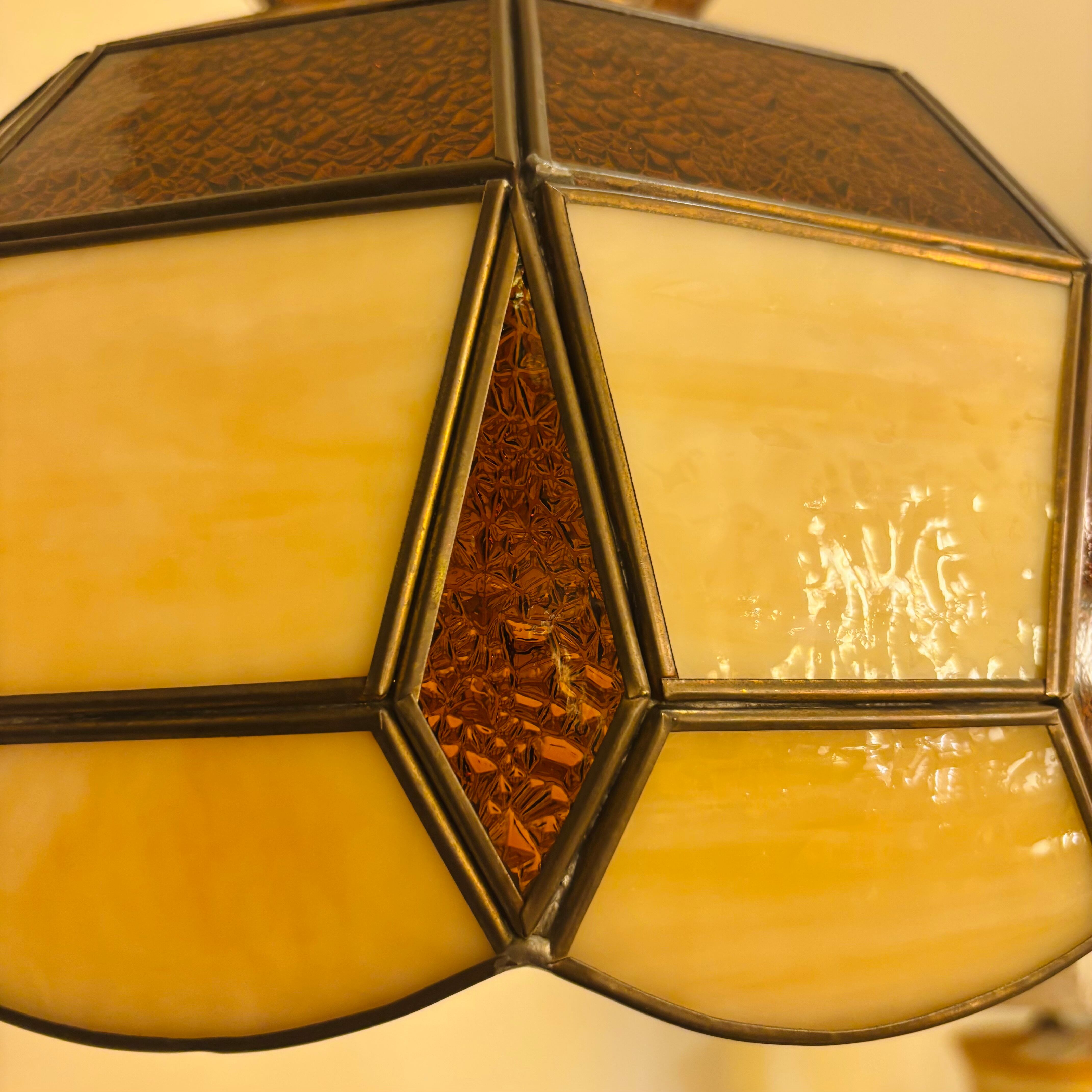 Vintage 70’s Stained Glass Pendant Lamp Shade Amber & Cream