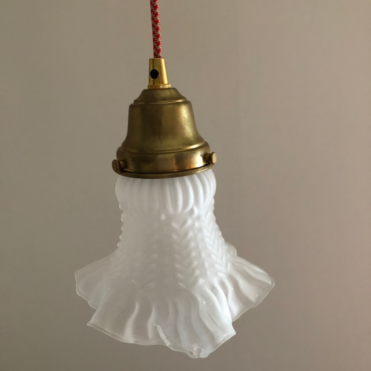 フランス製の手吹きガラスシェードを 赤とベージュの小判コード吊りにしました。製作時にできた穴があります。1950s-60sの感じです。