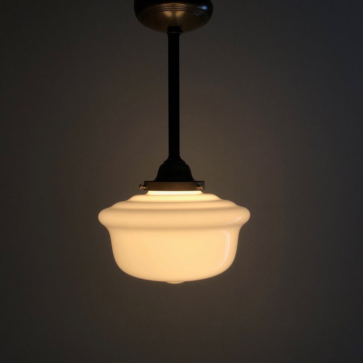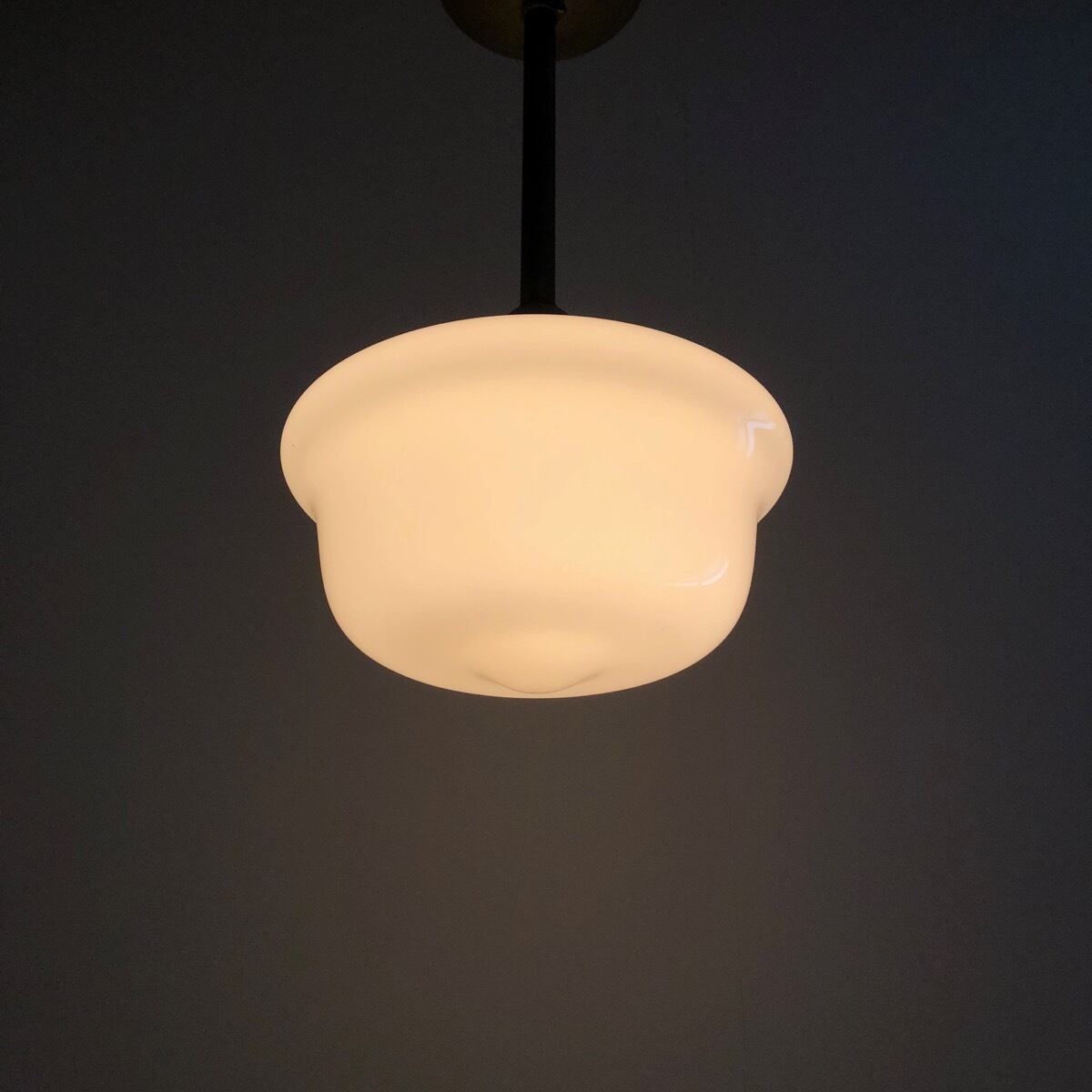1950s初頭に建築された荻窪の洋館解体時に出てきたものです。シェードだけでしたので、パティーナ仕上げの真鍮パーツで直径19mmの太いパイプ吊りにしました。建築主の仕事上、アメリカ製の可能性が高いです。