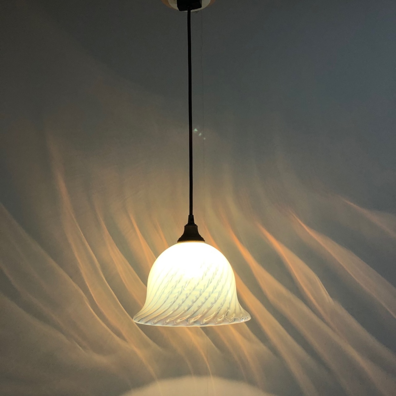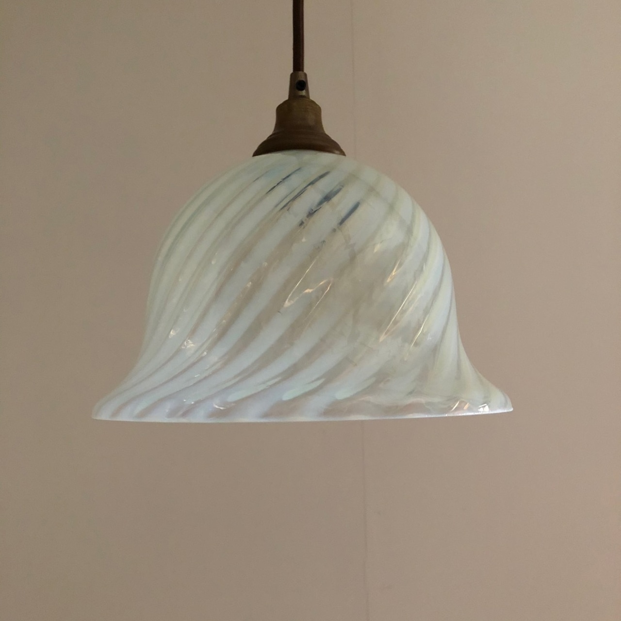 大きめの縁のない穴の空いたシェードで、ヨーロッパ製かもしれません。E12ソケットで吊れるように茶色の丸コードで器具を製作しました。1940s-50s頃の感じです。
