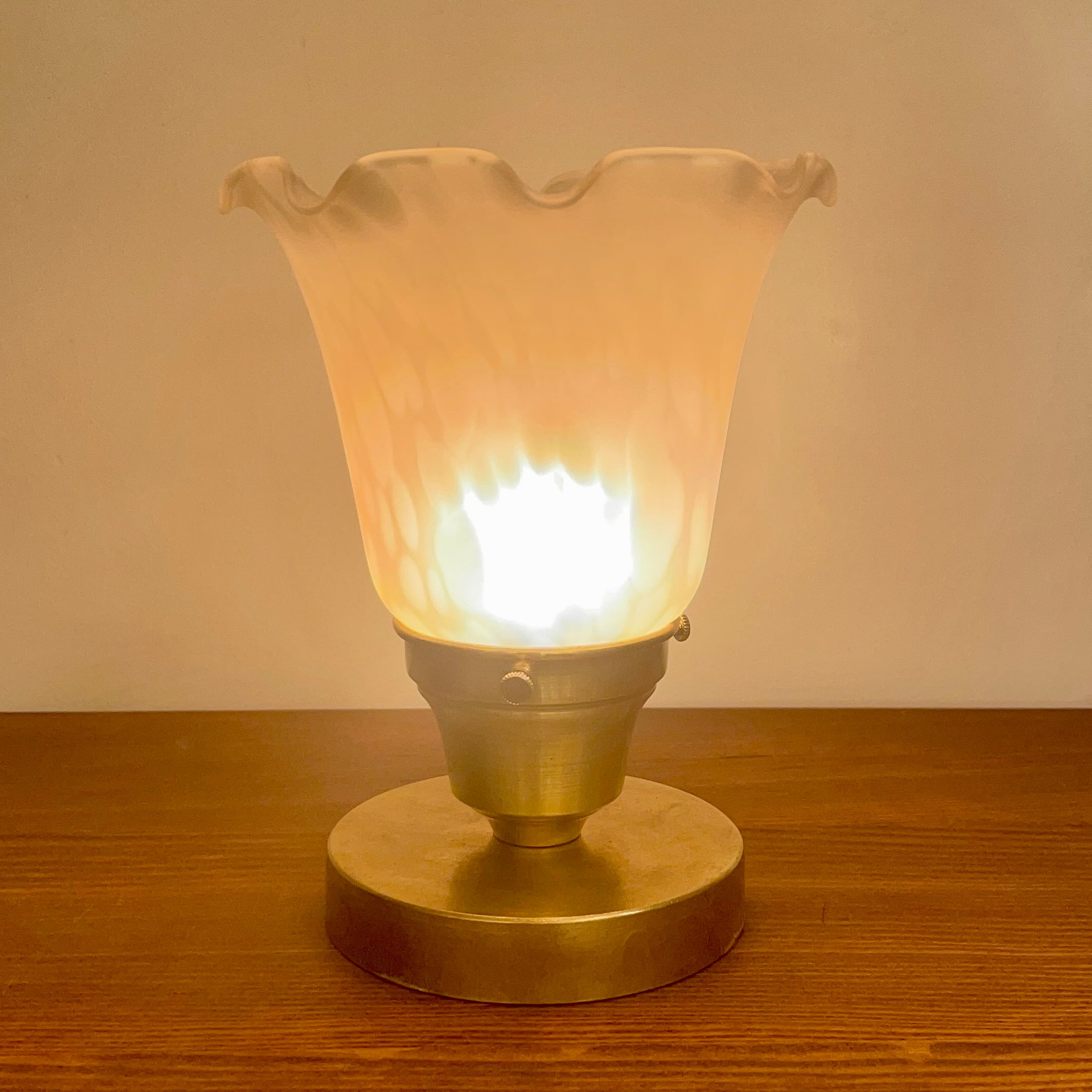 薄いガラスのビンテージアートガラスシェードと真鍮の台座を組み合わせました。