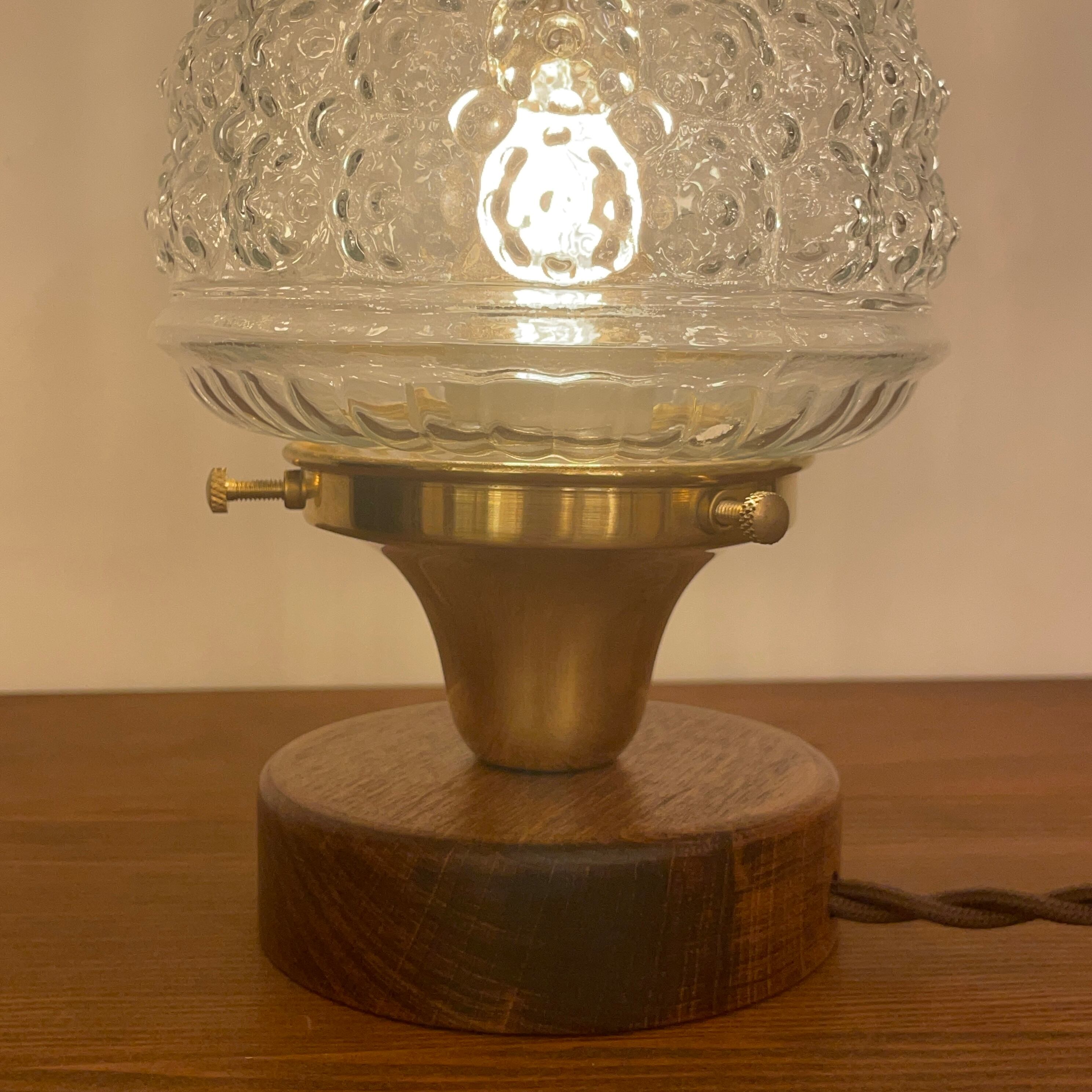 50〜60年代のものと思われるクリアのどんぐり型のビンテージシェードとオリジナルの木製の台座を組み合わせたテーブルランプです。凹凸のあるクリアガラスが光を反射します。