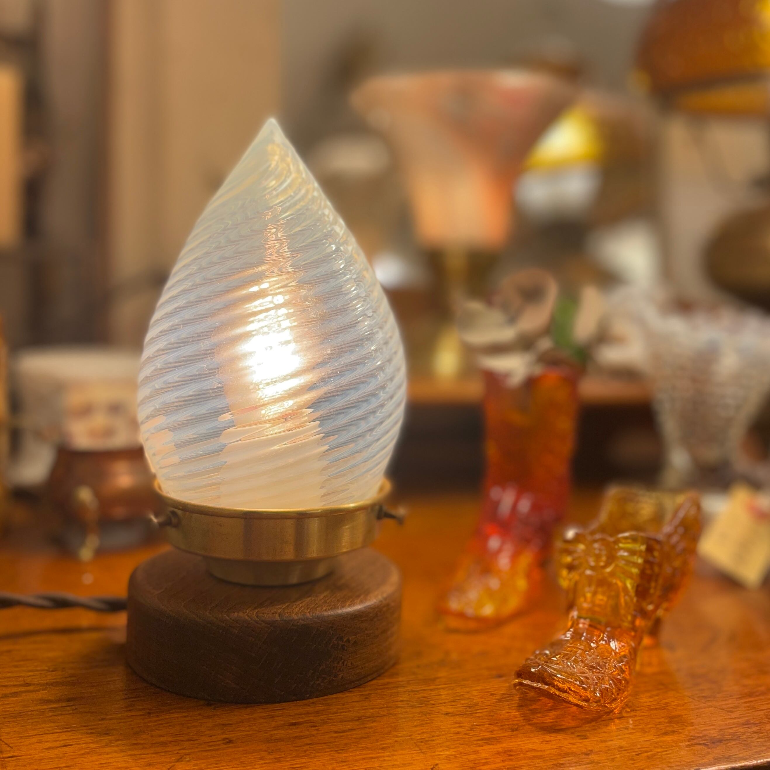アンティークのティアドロップ型のシェードとオリジナルの木製の台座を組み合わせたテーブルランプです。オパールセントのガラスを透した光は柔く暖かい色味の光になります。