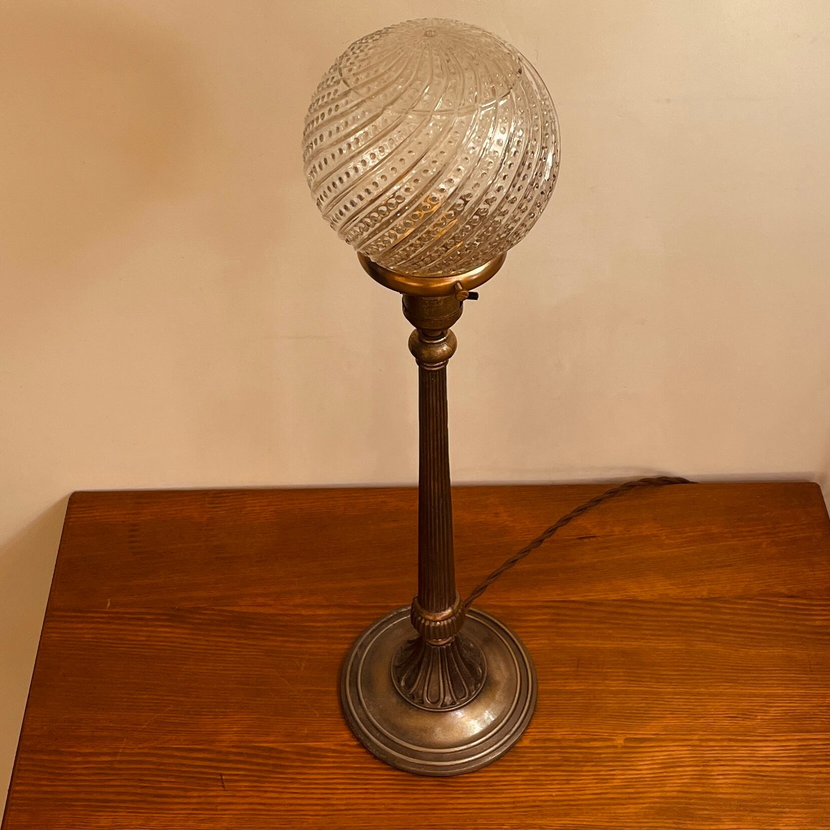 ミッドセンチュリーのビーズ模様の渦巻きのクリアなガラスシェードに高さのあるビンテージの支柱を組み合わせました。