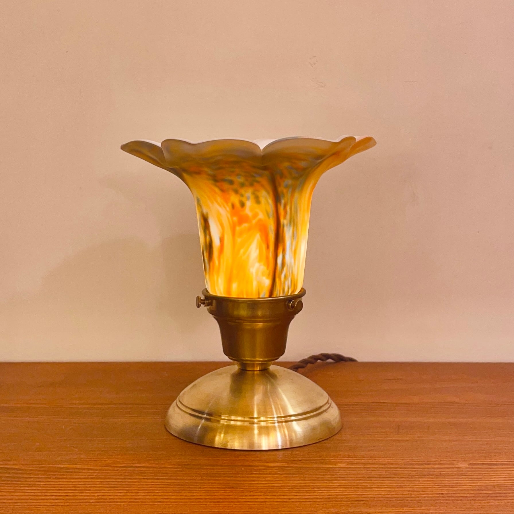 イギリスのビンテージのオレンジとブルーが鮮やかなアートガラスと真鍮製の土台を組み合わせたプチランプです。