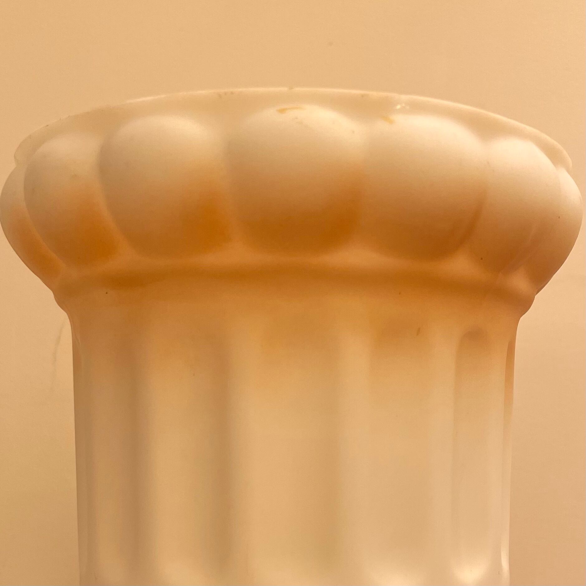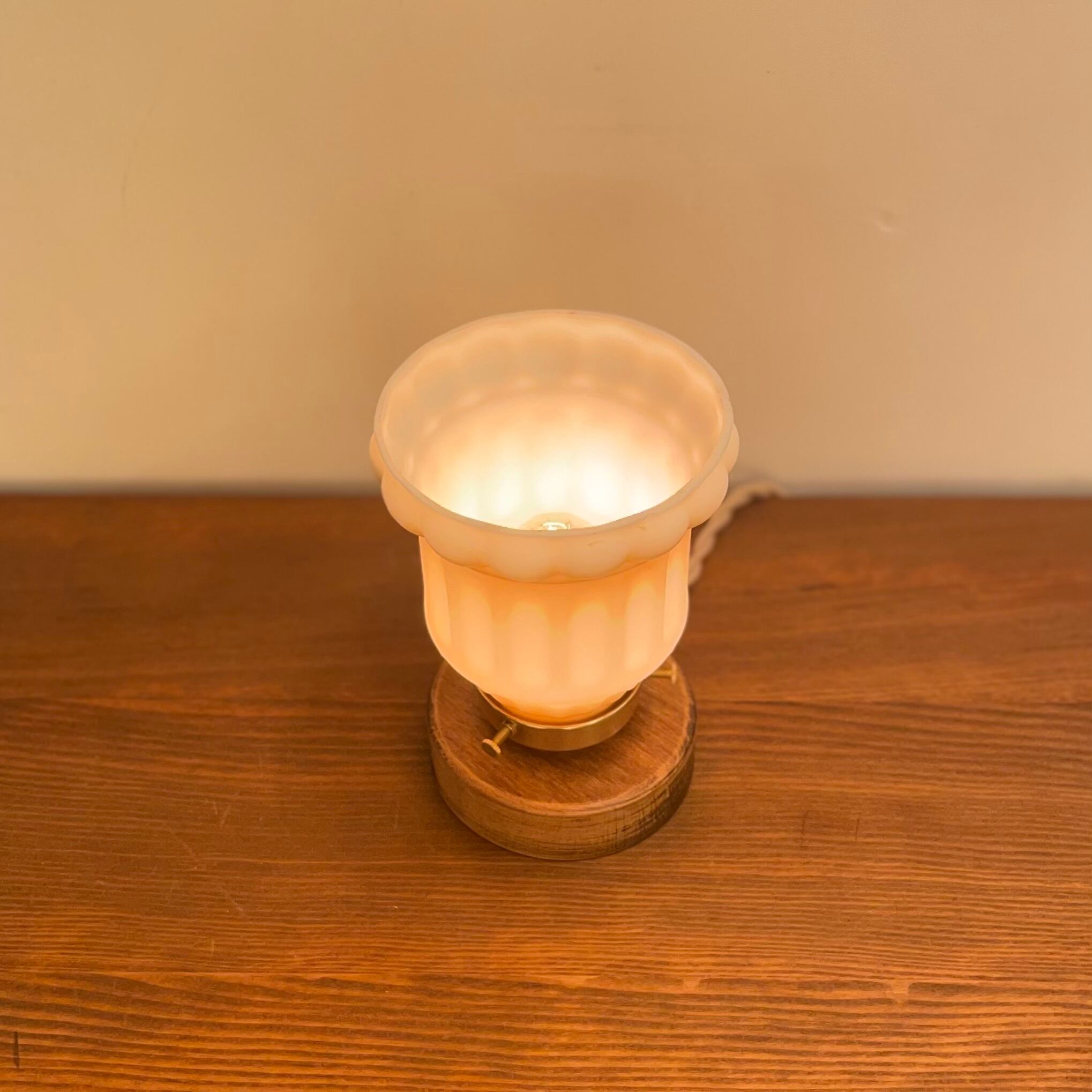 アメリカの20年代から40年代に製造されたサテンのミルクガラスに吹き付けでオレンジ色のカラーが入ったシェードです。木製土台を合わせました。